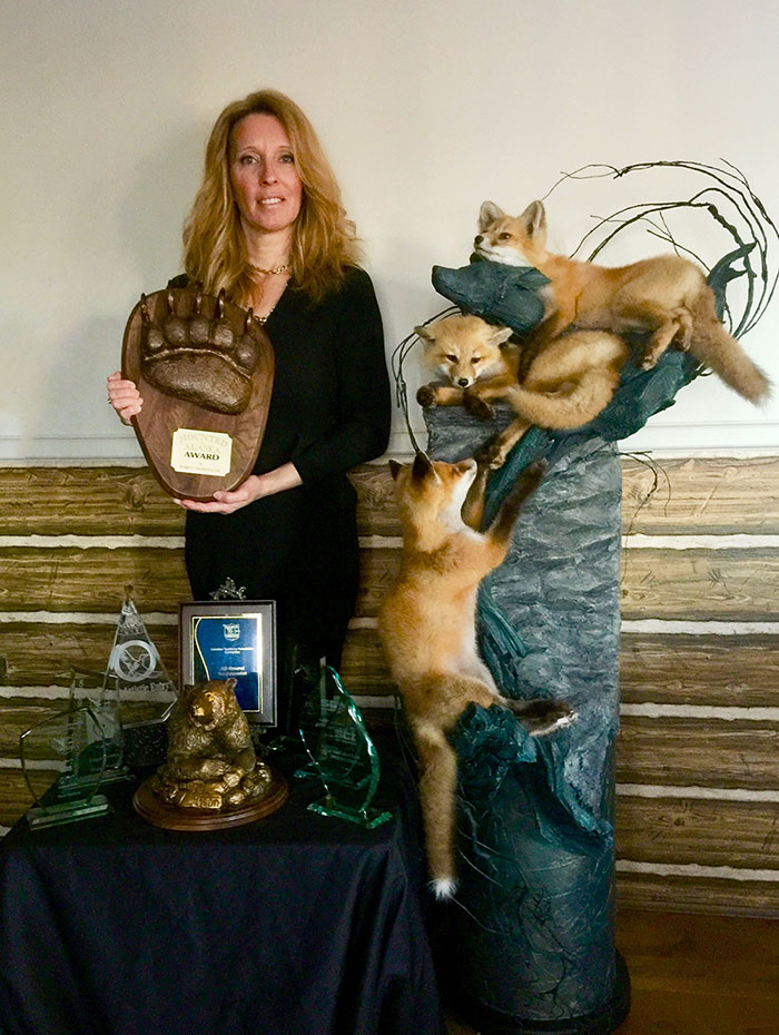Vicky Leblanc avec les 2 renardeaux qu’elle a présenté lors du World Taxidermy Championship à Springfield, Illinois en 2013.